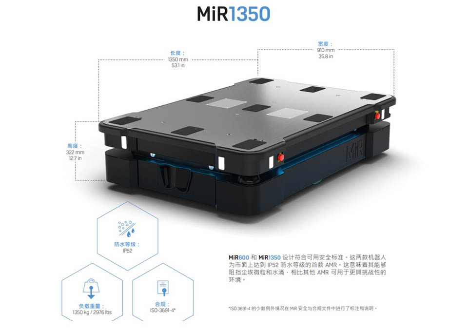 MiR1350自主移动机器人的有效负载为 1350 公斤,可以最大限度地提高物流运营效率,并安全地绕过各种障碍物进行操作。借助 MiR1350,可以高效地自动搬运极重货物和托盘。