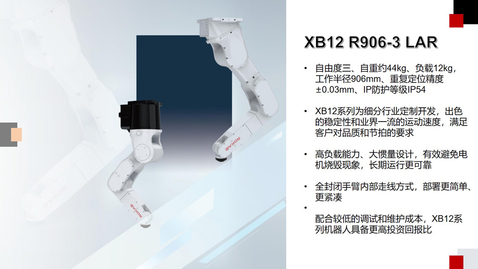 BFT机器人提供的珞石XB12 R906-3-LAR自由度三、自重约44kg、负载12kg,工作半径906mm、重复定位精度±0.03mm、IP防护等级IP54 XB12系列为细分行业定制开发,出色的稳定性和业界一流的运动速度,满足客户对品质和节拍的要求