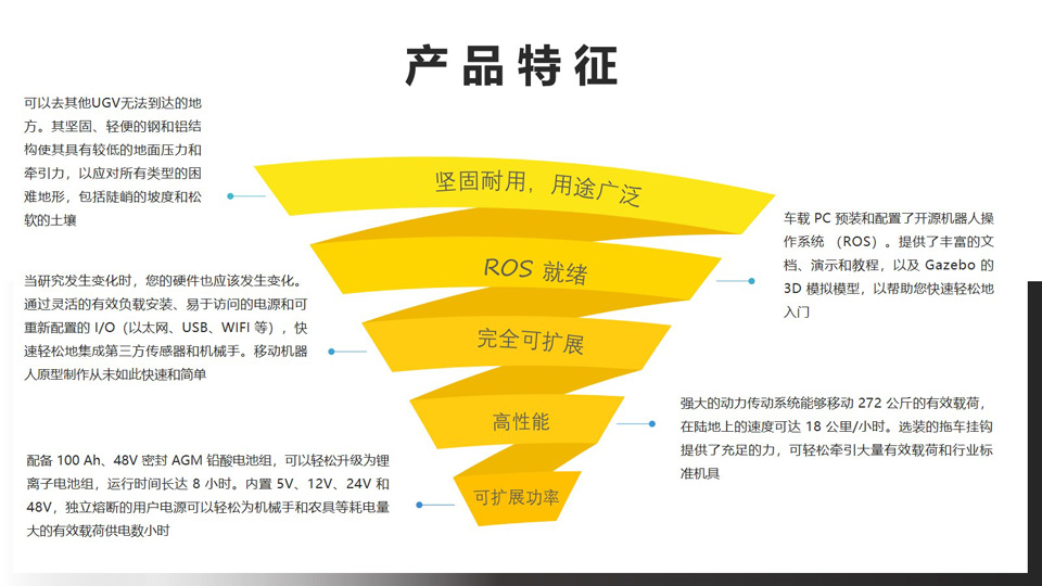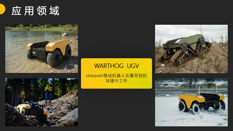 BFT机器人提供的WARTHOG UGV是一种大型全地形无人地面车辆,能够在水中进行短暂的运动。凭借其坚固的构造、低地压和牵引轮胎可以应对恶劣的环境,从而可以毫不费力地穿越松软的土壤、植被、厚厚的泥浆和陡峭的坡度。WARTHOG UGV有效载荷安装板和可访问的电源和通信端口使 Warthog 能够轻松定制传感器、机械手和其他有效载荷,以适应采矿、农业和环境监测中的各种机器人应用