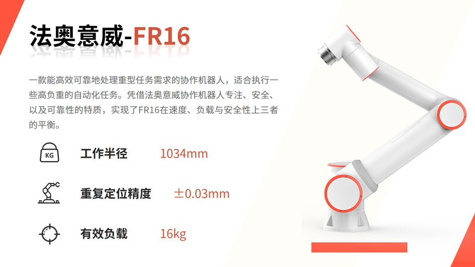 BFT机器人提供的法奥FR16是一款能高效可靠地处理重型任务需求的协作机器人,适合执行一些高负重的自动化任务。凭借法奥意威协作机器人专注、安全、以及可靠性的特质,实现了FR16在速度、负载与安全性上三者的平衡。