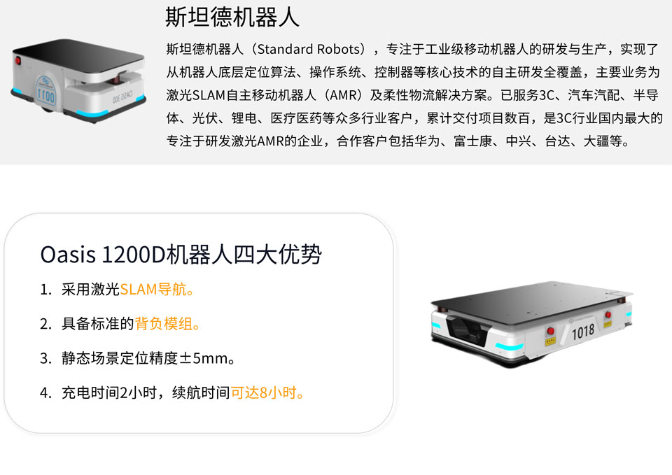 斯坦德Oasis 1200D移动机器人的额定负载1200kg,是斯坦德首款超1t负载的产品,高度仅260mm。主要应用于大负载场景,满足食品、汽车等行业应用需求。