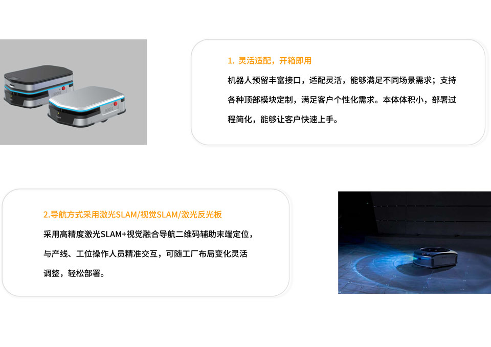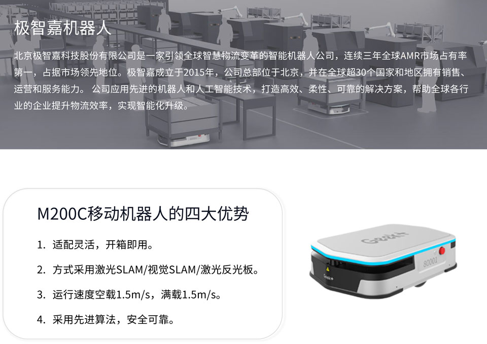 极智嘉M200C移动机器人的最高可负载300kg,支持多种上部定制模块控制,解锁更多应用场景,完美适配以电气、电子制造行业为代表的劳动密集型行业各种物流需求。