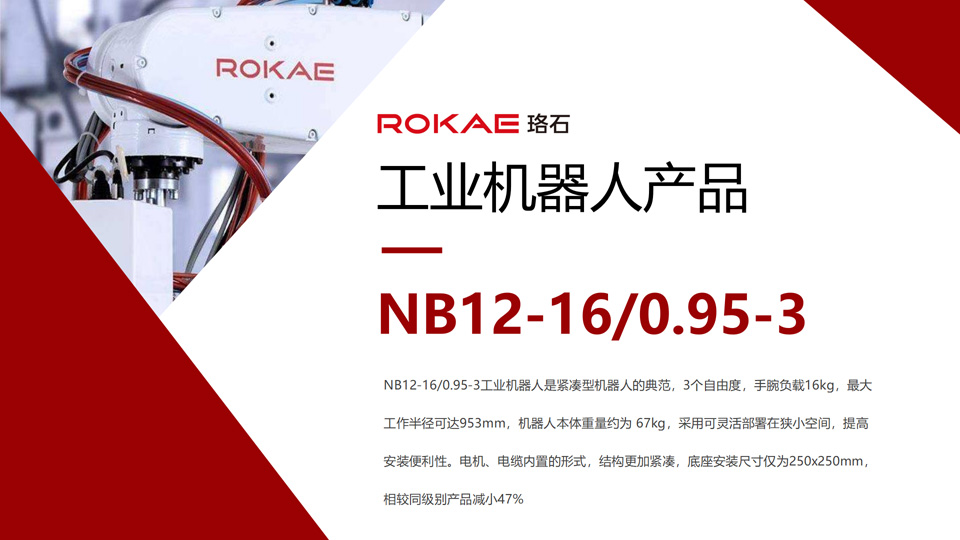 BFT机器人提供的NB12-16/0.95-3工业机器人是紧凑型机器人的典范,3个自由度,手腕负载16kg,最大工作半径可达953mm,机器人本体重量约为 67kg,采用可灵活部署在狭小空间,提高安装便利性。电机、电缆内置的形式,结构更加紧凑,底座安装尺寸仅为250x250mm,相较同级别产品减小47%