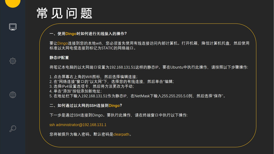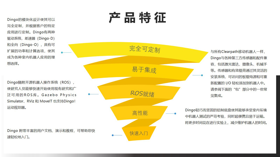 BFT机器人提供的Dingo是一款轻巧、紧凑的室内移动机器人,专为机器人研究和教育而设计。Dingo提供差速和全向两种驱动系统,具有可扩展的功率和计算选项,是各种机器人应用的理想选择,包括自主导航、移动操作和地图绘制。Dingo提供原生ROS和Gazebo集成,并且即插即用,兼容各种机器人传感器和配件。