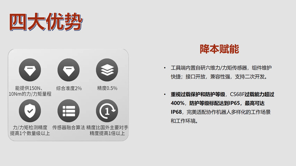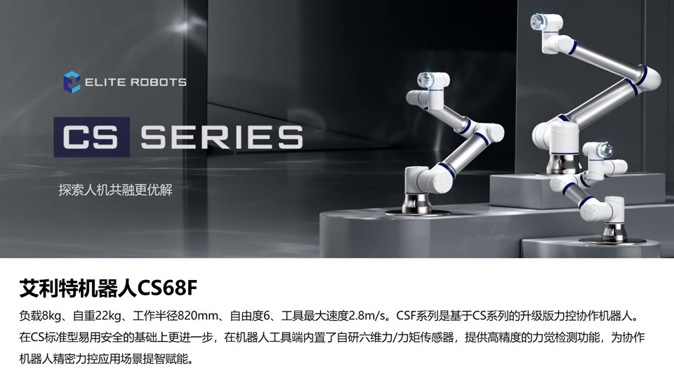 BFT机器人提供的艾利特协作机器人CS系列一一CS68F,负载8kg、自重22kg、工作半径820mm、自由度6、工具最大速度2.8m/s。能为用户、集成商、末端执行器和软硬件合作伙伴提供了简单易用的平台化工具,简化协作机器人从技术端到应用端的落地,将用户对于自动化的所想迅速变为工厂中可部署的方案。