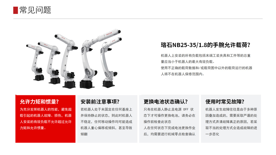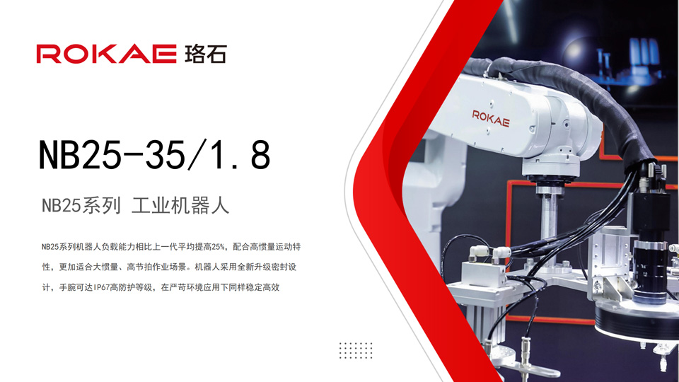 BFT机器人提供的NB25-35/1.8工业机器人手腕负载35kg,本体质量约重256kg,6个自由度,工作范围可达1813mm,NB25系列作为满足不同场景多样化应用需求的产品,也在保证可靠性的同时,优化了作业速度,帮助实现最大化生产效率