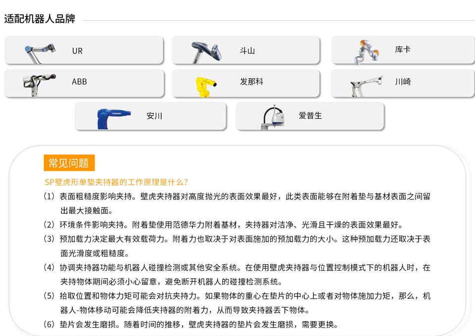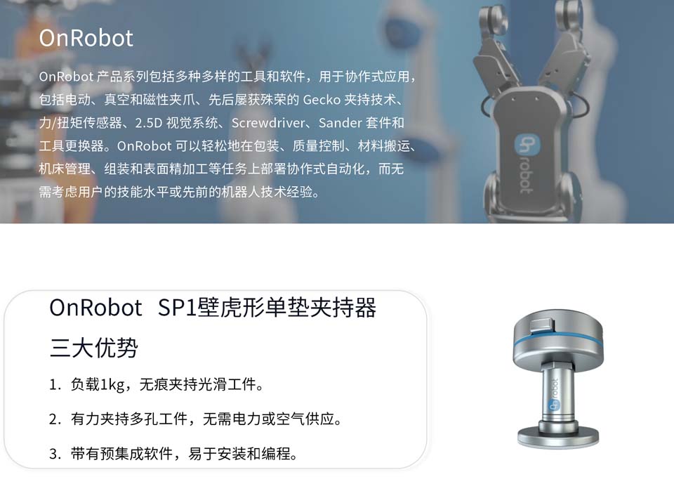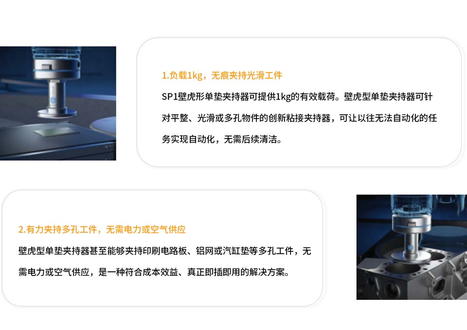OnRobot Gecko SP1壁虎形单垫夹持器将创新的壁虎型粘接夹持器技术带入以往无法自动化的小型应用。灵感源自壁虎的粘接技术可实现精准、无痕的夹持,更适用于电路板等多孔物件或光滑表面,而无需执行清洁流程。Gecko SP1夹持器负载1kg,无痕夹持光滑工件,且带有预集成软件,易于安装和编程。