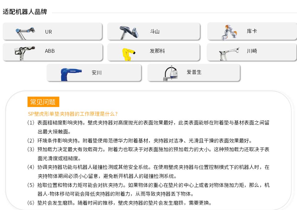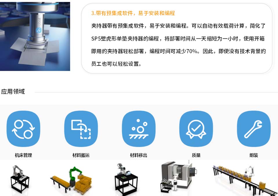 OnRobot Gecko SP5壁虎形单垫夹持器将创新的壁虎型粘接夹持器技术带入以往无法自动化的小型应用。灵感源自壁虎的粘接技术可实现精准、无痕的夹持,更适用于电路板等多孔物件或光滑表面,而无需执行清洁流程。OnRobot Gecko SP5负载5kg,带有预集成软件,易于安装和编程,轻松部署。