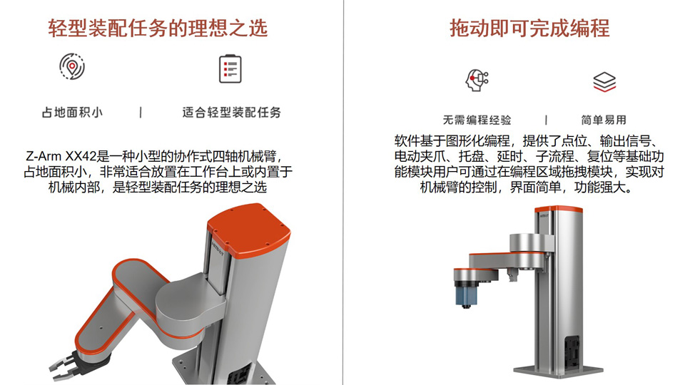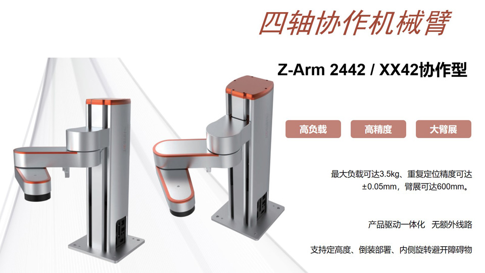 BFT机器人提供的慧灵Z-Arm 2442/XX42协作型 臂长:420mm 重复定位精度:±0.03mm Z轴(高度)可定制范围: 0.1m~0.5m 最大负载: 3KG 支持碰撞检测、拖动示教、硬急停、调试/在线升级(USB口)