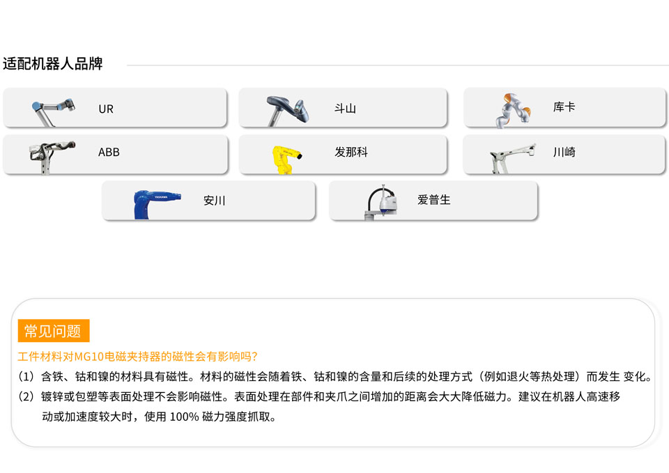 OnRobot MG10 电磁夹持器的磁力可轻松配置,作用力可调,是完成诸如一次卸垛金属板等富有挑战性工作的理想之选。内置型近程传感器可检测零件是否已拾取,多磁体设置可以满足对处理工艺可靠性要求较高的大型或重型工件应用。MG10负载10kg,无需外部空气供给,安装快速方便,没有额外成本。