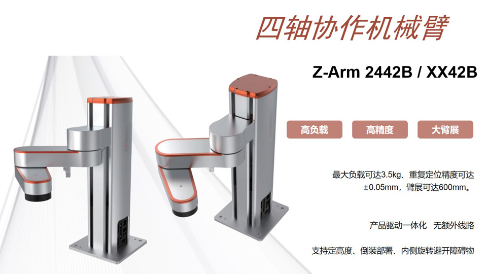 BFT机器人提供的四轴协作机械臂Z-Arm 2442B/XX42B 臂长:420mm 重复定位精度:±0.02mm Z轴(高度)可定制范围: 0.1m~0.5m 最大负载: 5KG 支持硬急停、调试/在线升级(USB口)