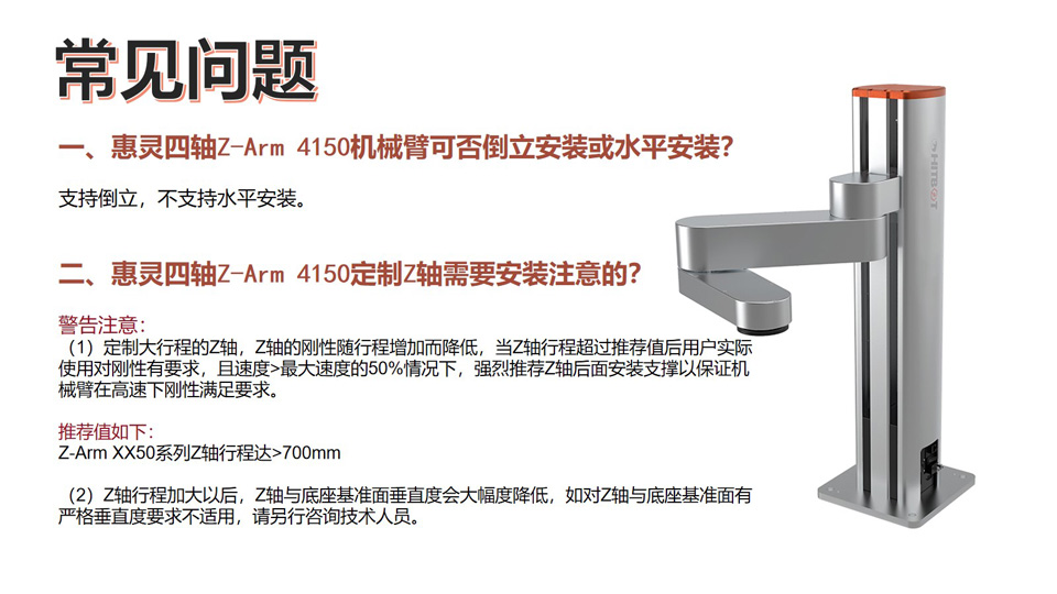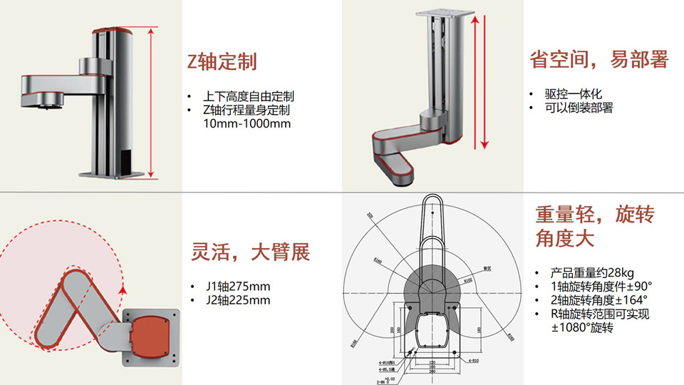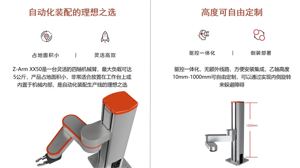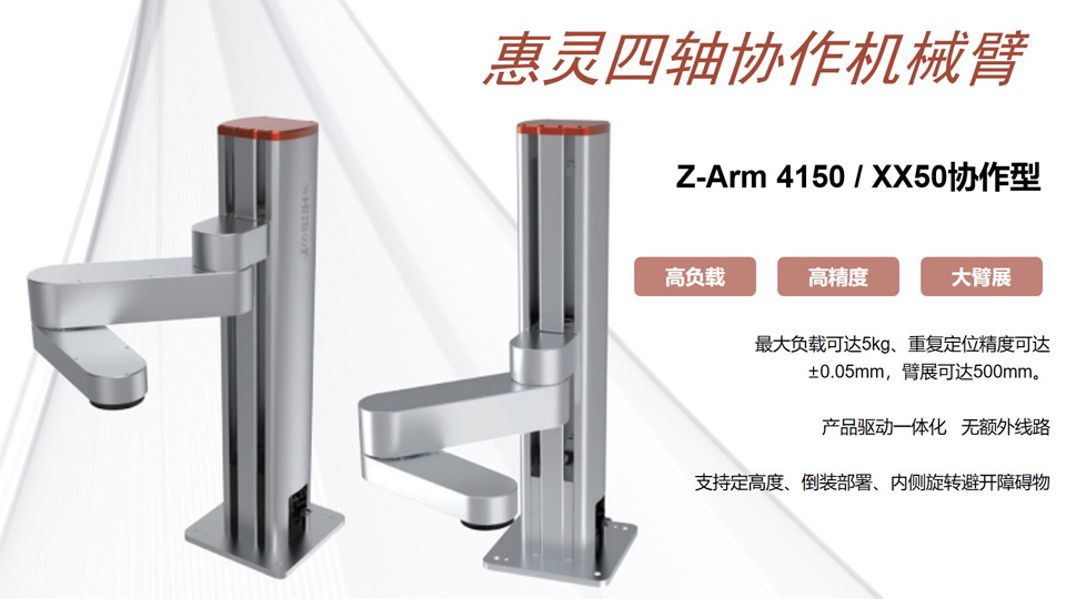 BFT机器人提供的四轴协作机械臂Z-Arm 4150 臂长:410mm 重复定位精度:±0.05mm Z轴(高度)可定制范围: 0.1m~1m 最大负载: 5KG 支持拖动示教、硬急停、调试/在线升级(USB口)