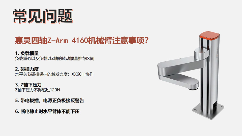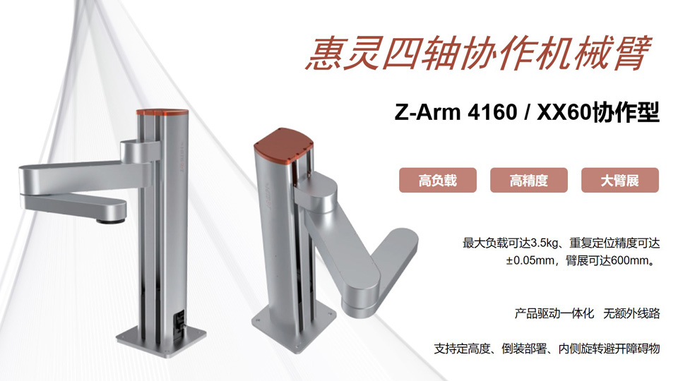 BFT机器人提供的慧灵四轴协作机械臂Z-Arm 4160 臂长:600mm 重复定位精度:±0.05mm Z轴(高度)可定制范围: 0.1m~1m 最大负载: 3.5KG 支持碰撞检测、拖动示教、硬急停、调试/在线升级(USB口)