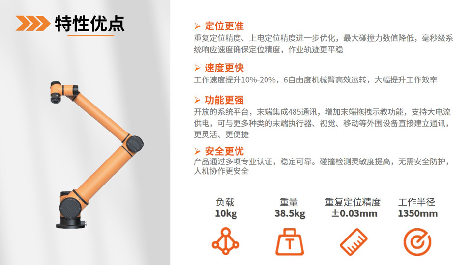 BFT机器人一站式机器人工业互联网平台提供的AUBO-i10H协作机器人最大工作半径1350mm。负载10kg,兼具±0.03mm的重复定位精度。大负载、工作半径长。