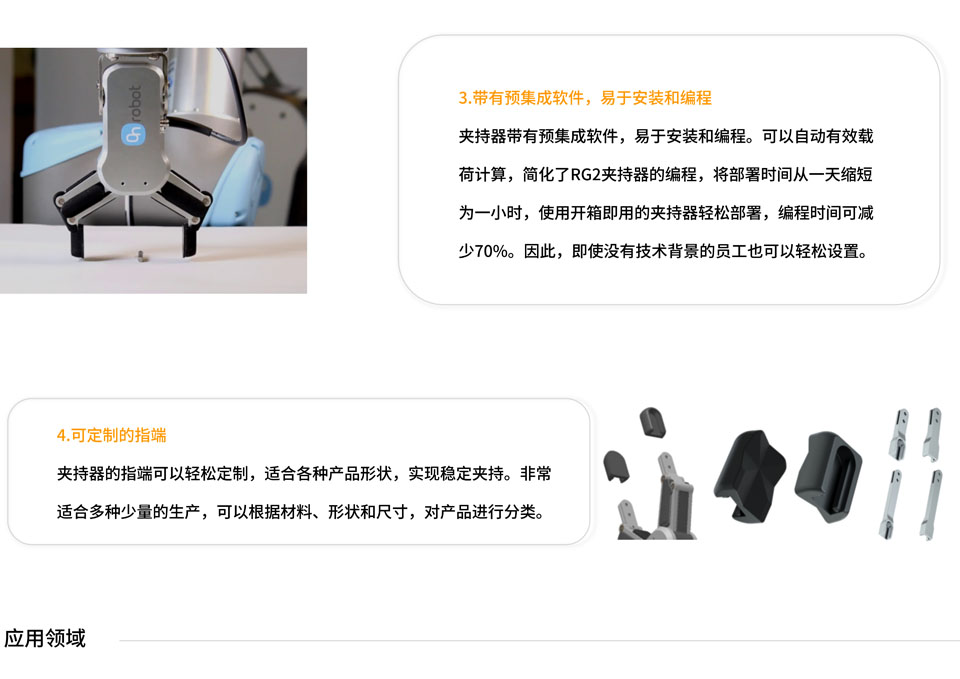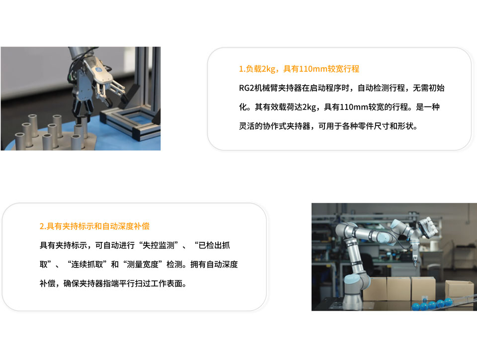 RG2夹持器是一款灵活的协作式夹持器,内置OnRobot快换装置。全新支架设计,让夹持器方向控制变得更简单,同时保留了出色的移动、放置行程。