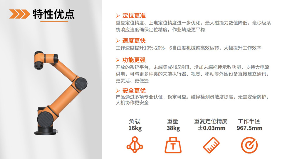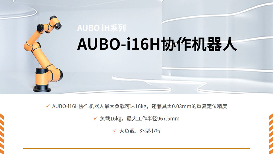 BFT机器人一站式机器人工业互联网平台提供的AUBO-i16H协作机器人最大负载可达16kg,还兼具±0.03mm的重复定位精度。负载16kg,最大工作半径967.5mm。大负载、外型小巧。