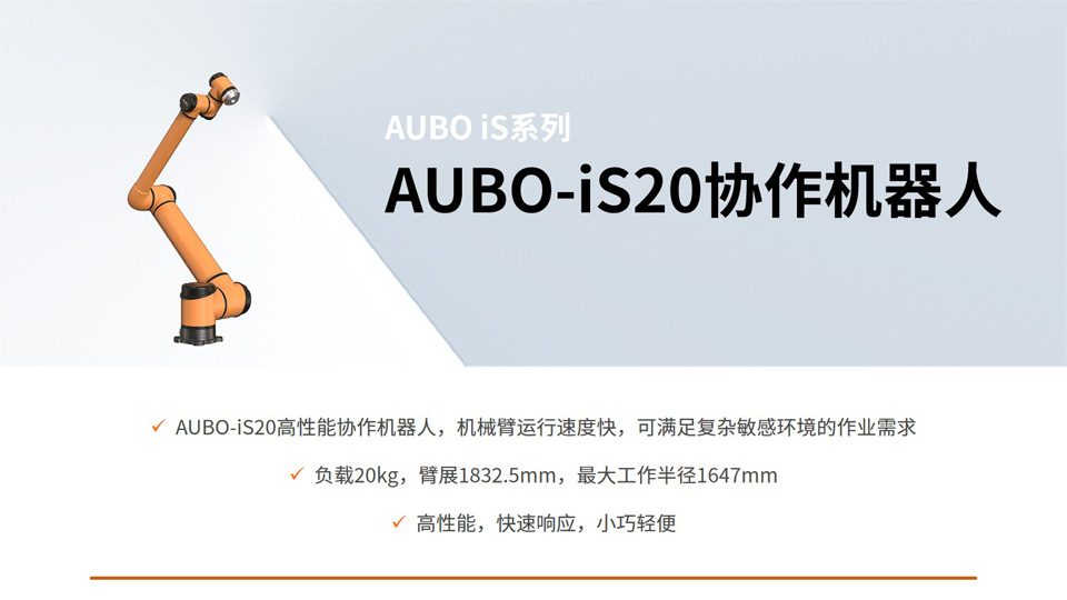 BFT机器人一站式机器人工业互联网平台提供的AUBO-iS20高性能协作机器人,机械臂运行速度快,可满足复杂敏感环境的作业需求。负载20kg,臂展1832.5mm,最大工作半径1647mm。高性能,快速响应,小巧轻便。