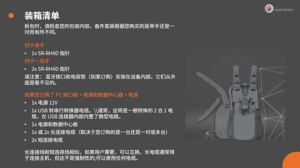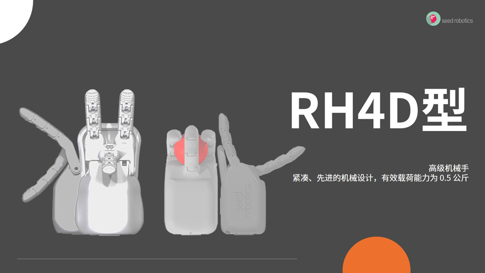 BFT机器人一站式机器人工业互联网平台提供的Seed Robotics SR-RH4D(以前称为 SR-DH4D)手是一款驱动不足的高级机械手,总共提供 11DoF 和 4 个驱动 DoF(使用 4 个智能执行器)。该装置能够同时接收来自多个接口的命令:主连接器(RS485 或 TTL)、USB 和可选的蓝牙。