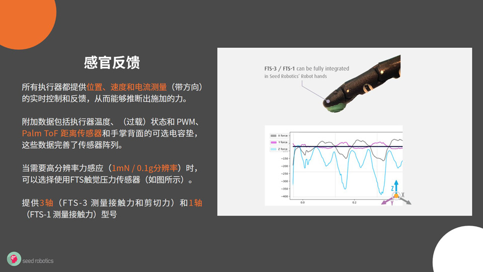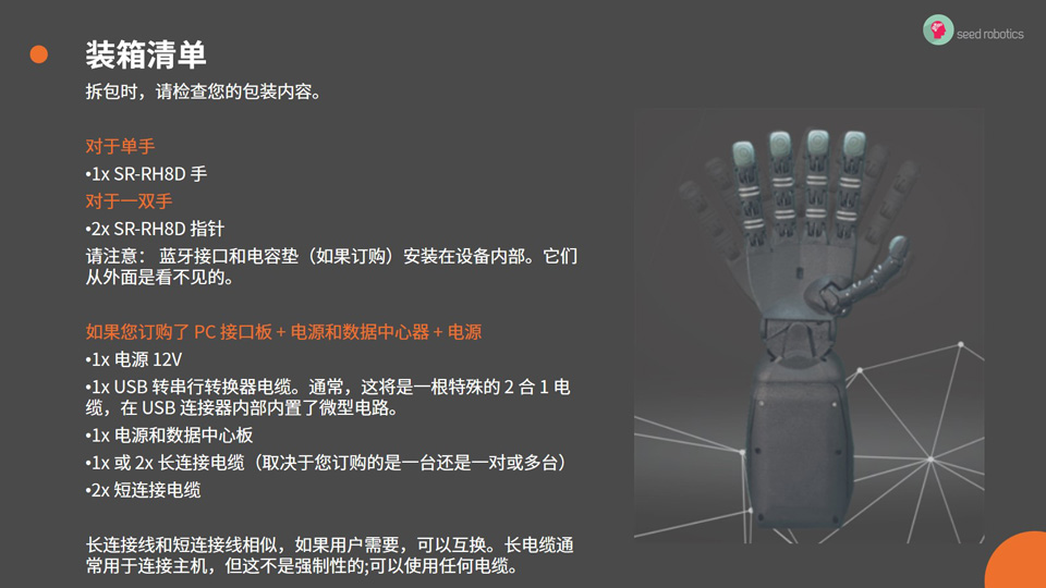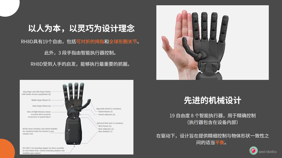 BFT机器人一站式机器人工业互联网平台提供的Seed Robotics SR-RH8D是一款成人尺寸的拟人化手部模型,具有相对的拇指控制和全球形手腕关节。该模型与其他 Seed Robotics 模型一样使用相同的 Eros 架构,因此大部分操作细节与其他模型相似。