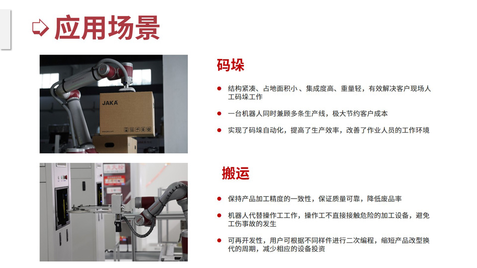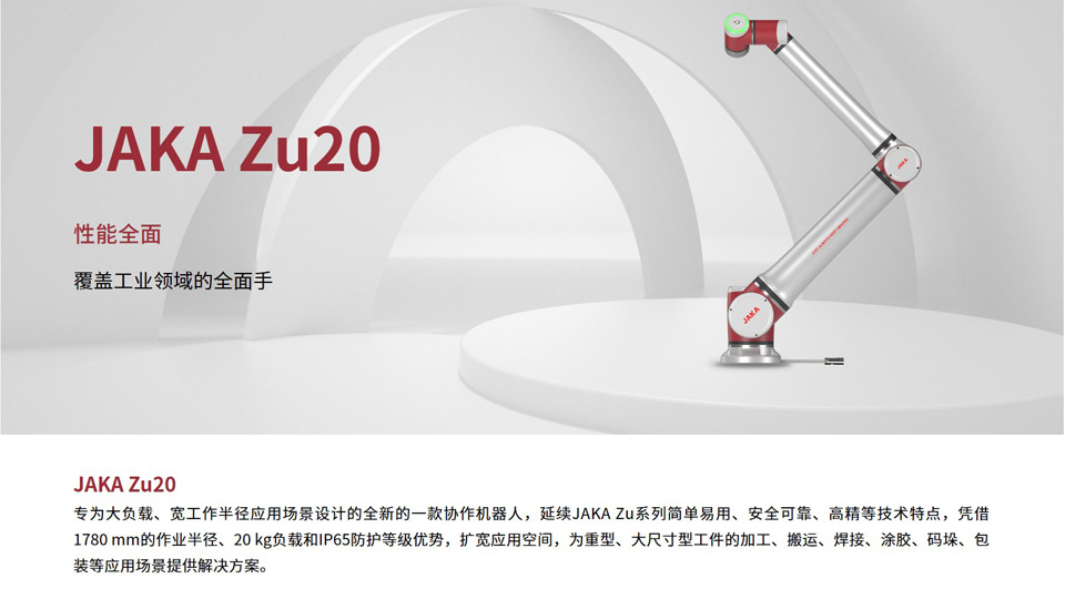 BFT机器人提供的JAKA Zu20专为大负载、宽工作半径应用场景设计的全新的一款协作机器人,延续JAKA Zu系列简单易用、安全可靠、高精等技术特点,凭借1780 mm的作业半径、20 kg负载和IP65防护等级优势,扩宽应用空间,为重型、大尺寸型工件的加工、搬运、焊接、涂胶、码垛、包装等应用场景提供解决方案。