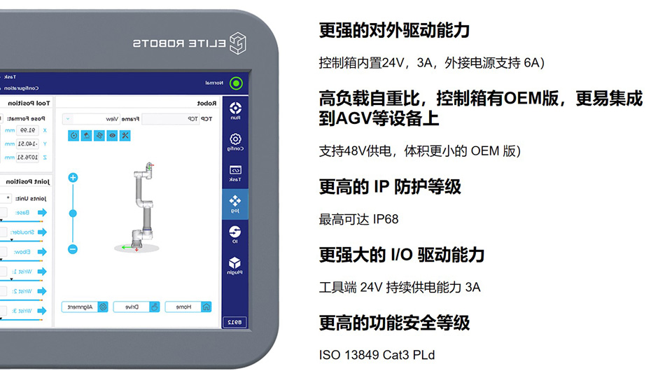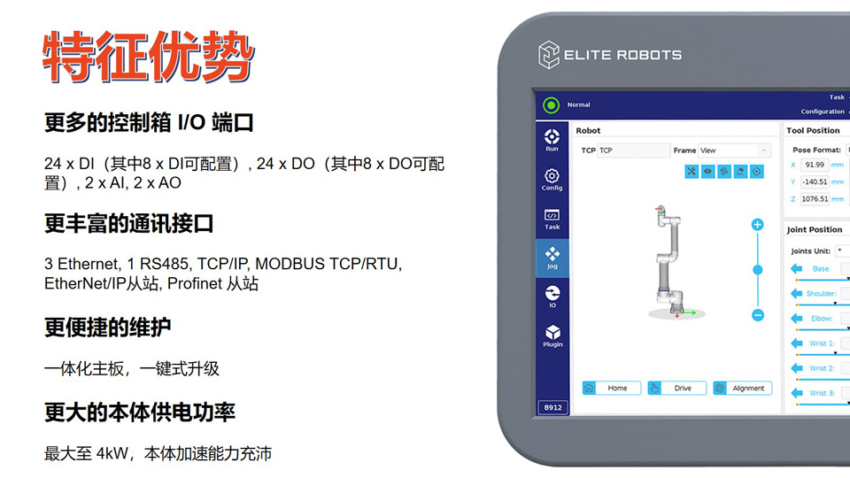 BFT机器人提供的艾利特协作机器人CS系列一一艾利特机器人CS618负载18kg、自重33kg、工作半径954mm、自由度6、工具最大速度3.4m/s。艾利特CS系列协作机器人为用户、集成商、末端执行器和软硬件合作伙伴提供了简单易用的平台化工具,简化协作机器人从技术端到应用端的落地,将用户对于自动化的所想迅速变为工厂中可部署的方案。