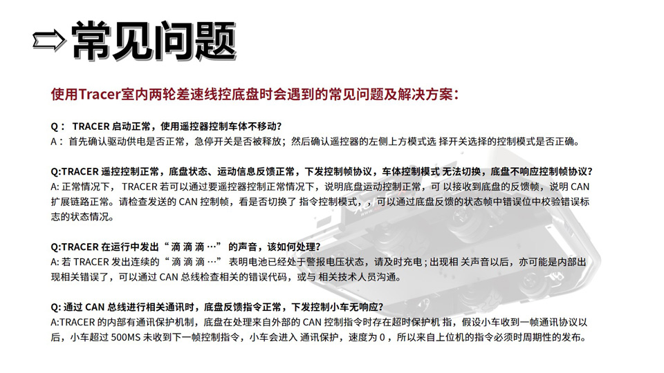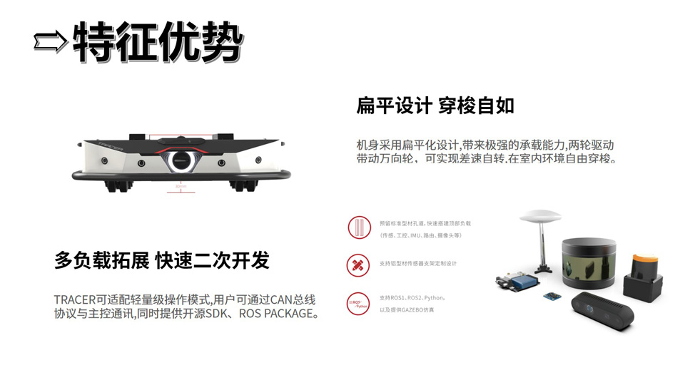 BFT机器人提供的室内两轮差速线控底盘Tracer作为一款两轮差速AGV,在室内运输领域具有独特的优势,小巧灵活的结构使得它能自由穿梭在各种室内环境,高承载能力及强劲动力搭配使它单次搬运效率有极大的优势,搭配感知系统更能自主运行,成本低、效率高、部署快,是室内运输场景的性价比之王。用户可以直接搭建上装并设定AGV的路线,以满足柔性化生产需求。