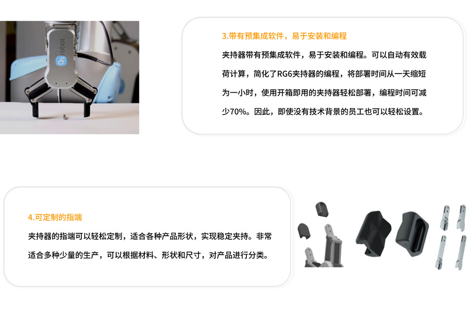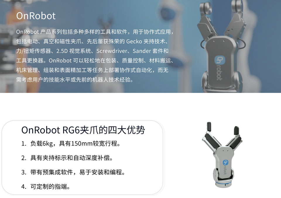 OnRobot RG6 机械臂夹持器夹爪的有效载荷达6kg,是一种灵活的协作式夹持器,行程达150mm。其特征包括智能化、快速部署,和轻松定制以及编程。OnRobot RG6夹爪指端可以轻松定制,适合各种产品形状,实现稳定夹持。Onrobot RG6 带有预集成软件,易于安装和编程,即使普通用户也能快速掌握并使用。