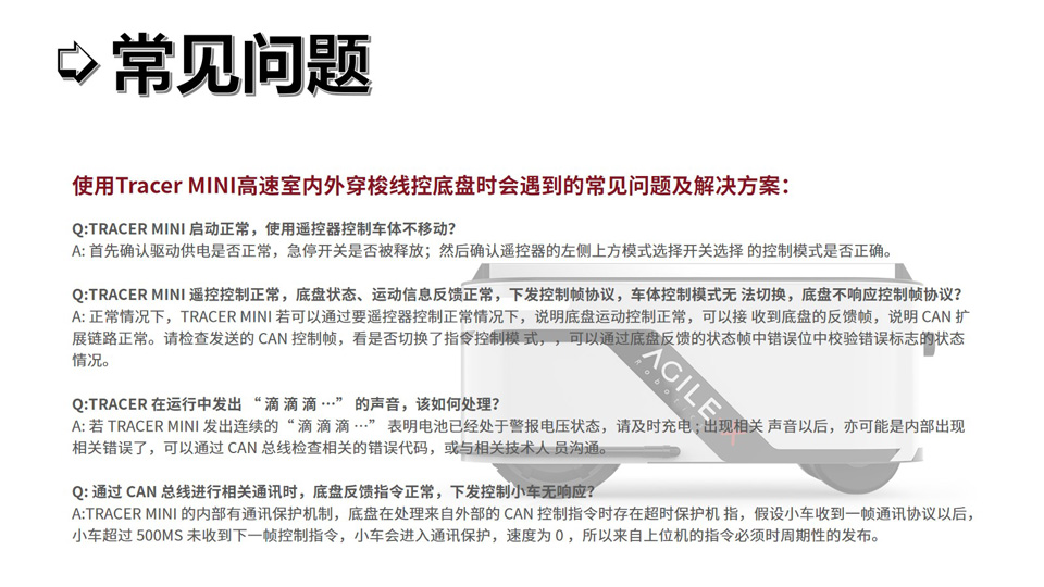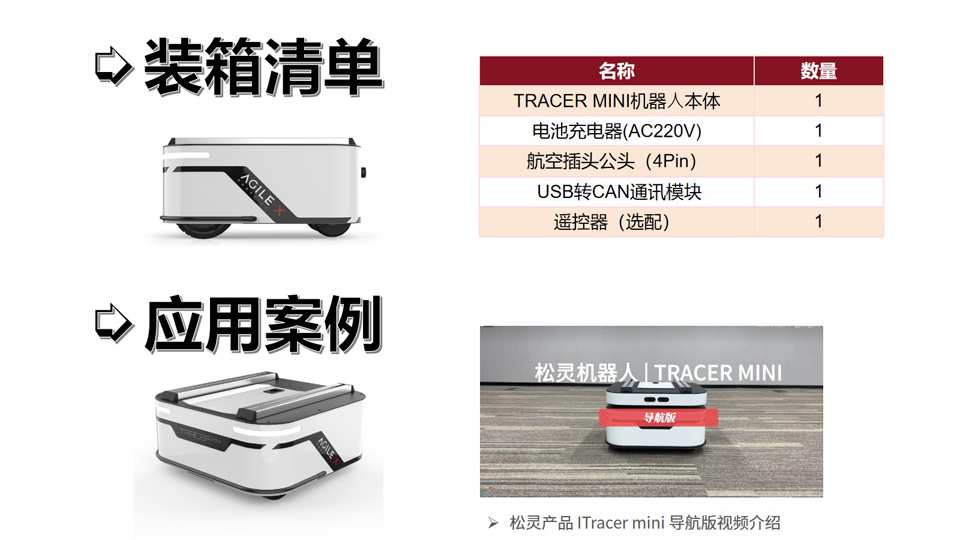 BFT机器人提供的极具性价比的高速室内外穿梭线控底盘AGV开发平台TRACER Mini具有摇摆臂悬挂钢质车身,采用两轮驱动带动万向轮的设计,可实现差速自转,不仅具有爬越小坡的动力,也带来了室外常规路面环境适应性。体积更为紧凑小巧。高速度、高承载能力及强劲动力的组合使它单次搬运效率有极大的优势,开发者可以快速搭载感知系统投入研究,成本低、效率高、部署快。