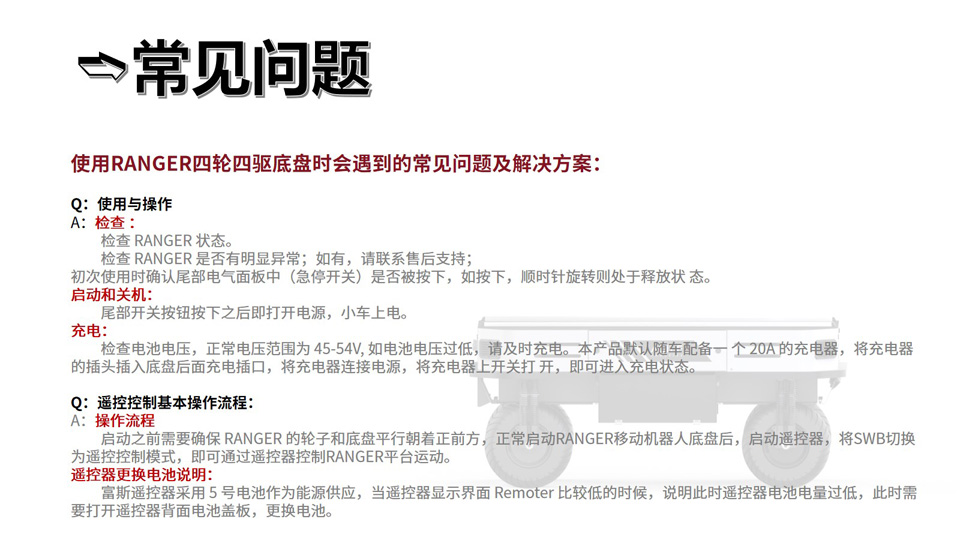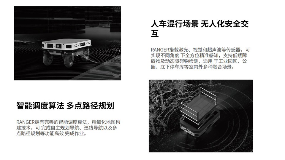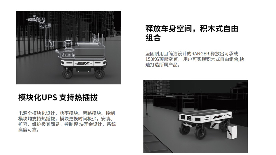 BFT机器人提供的松灵RANGER四轮四驱底盘150KG四驱四转底盘机器人采用驱动转向悬挂一体化的独立驱动模组设计, 具备可在原地或行驶中360°任意转向功能。RANGER搭载4个轮毂伺服电机,能够实现原地自转、蛇形行驶和阿克曼转弯等功能。此外,机器人还具备悬架设计,赋予其灵活的运动性、零转弯半径和平稳的行驶体验。其高精度的轨迹跟踪功能,使其尤其适合自动驾驶应用。
