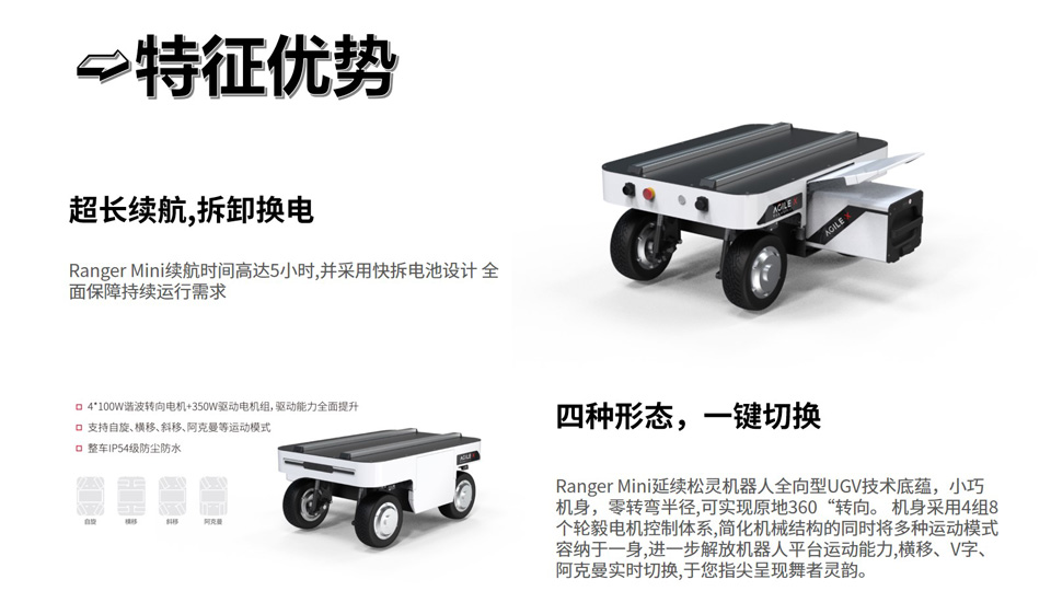 BFT机器人提供的松灵Ranger Mini是松灵机器人打造的全新的全向型UGV,现已更新至3.0版本。基于全新的四轮四转运动控制理论,采用驱动转向一体化的独立驱动模组设计,具备多种灵活运动模式,强大的机动性与灵活性携手并进,为移动机器人平台进入更多的空间带来更多可能。