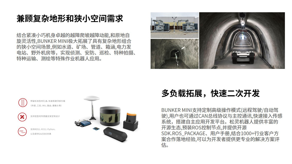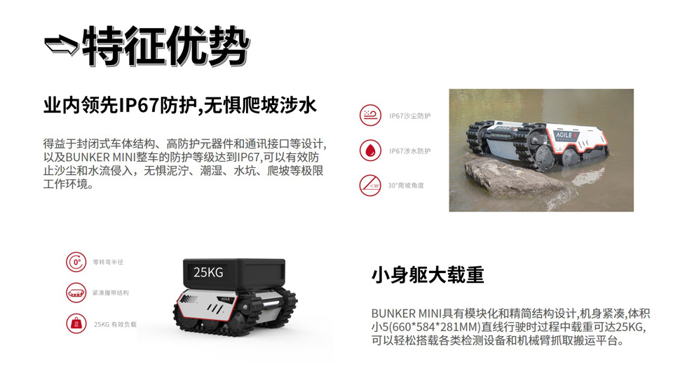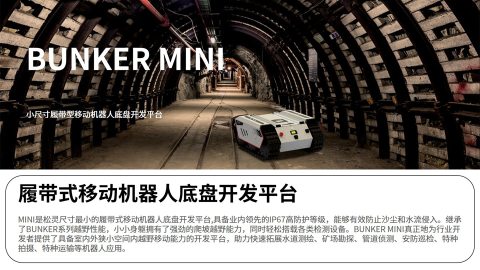 BFT机器人提供的履带式移动机器人底盘开发平台BUNKER MINI是松灵尺寸最小的履带式移动机器人底盘开发平台,具备业内领先的IP67高防护等级,能够有效防止沙尘和水流侵入。继承了BUNKER系列越野性能,小小身躯拥有了强劲的爬坡越野能力,同时轻松搭载各类检测设备。BUNKER MINI真正地为行业开发者提供了具备室内外狭小空间内越野移动能力的开发平台,助力快速拓展水道测绘、矿场勘探、管道侦测、安防巡检、特种拍摄、特种运输等机器人应用。