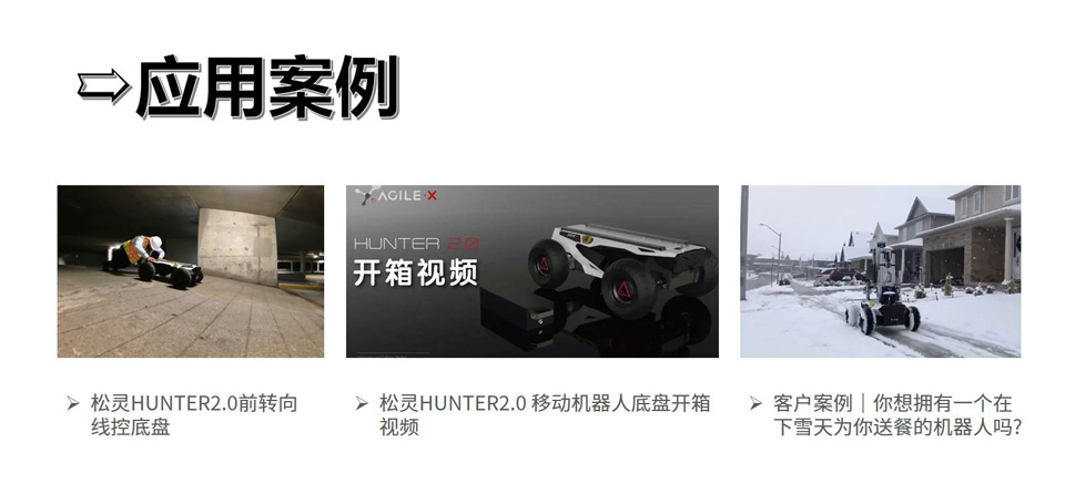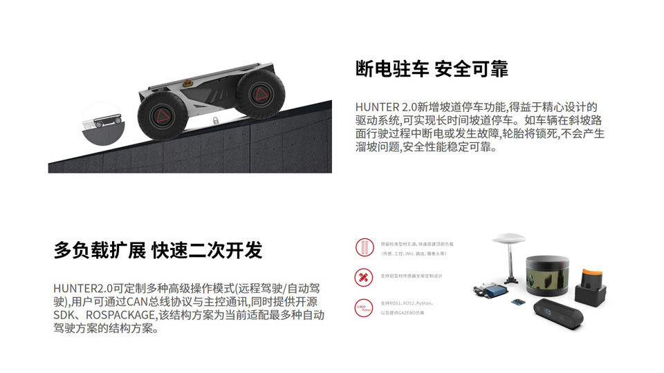 BFT机器人提供的松灵HUNTER 2.0为低速无人驾驶应用而诞生,前轮阿克曼转向结构,摇摆臂悬挂,轻松跨越各种道路障碍,动力系统全新迭代,拥有更强承载、续航能力,革命性电池仓设计,快速更换电池,配置CAN\232二次开发接口,标准安装组件,为移动机器人无人驾驶应用提供最佳移动解决方案。HUNTER2.0电池采用磷酸铁锤方案,配置灵活,可根据任务需要定制不同容量电池组。支持速度定制化升级。