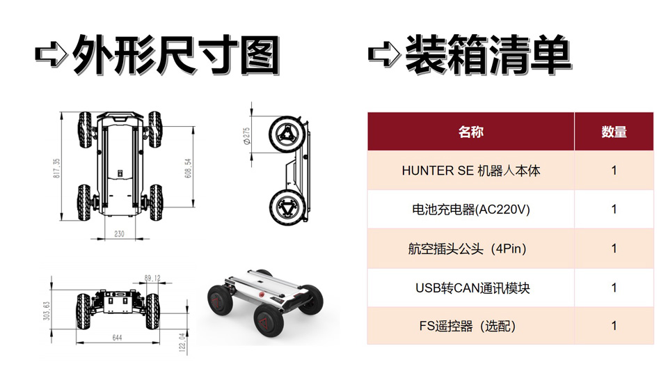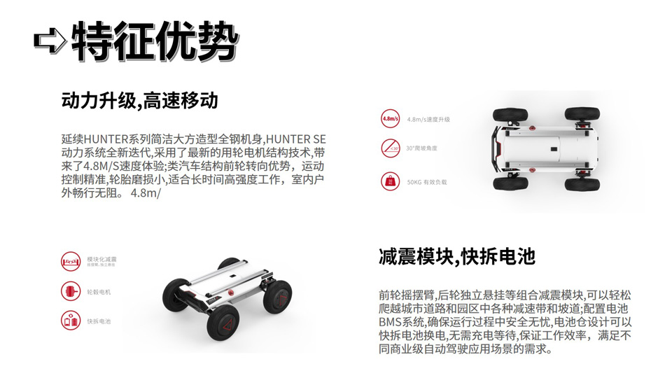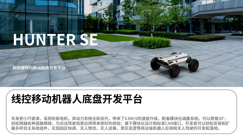 BFT机器人提供的松灵HUNTER SE是阿克曼线控移动机器人底盘开发平台。车身更小巧紧凑,采用轮毂电机,其动力系统全新迭代,带来了4.8M/S的速度升级,配备模块化减震系统,可以爬坡30°,轻松跨越各种道路障碍,为自动驾驶场景应用带来更好的体验;基于模块化设计和标准CAN接口,开发者可以轻松安装和扩展多样自主系统组件,实现园区快递、无人物流、无人送餐、景区巡逻等商业级机器人应用和无人驾驶的开发和落地。