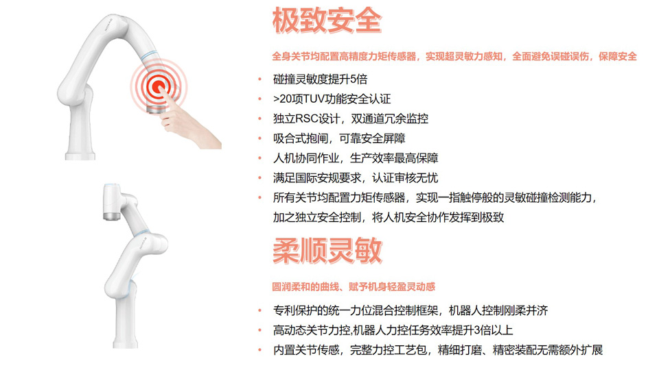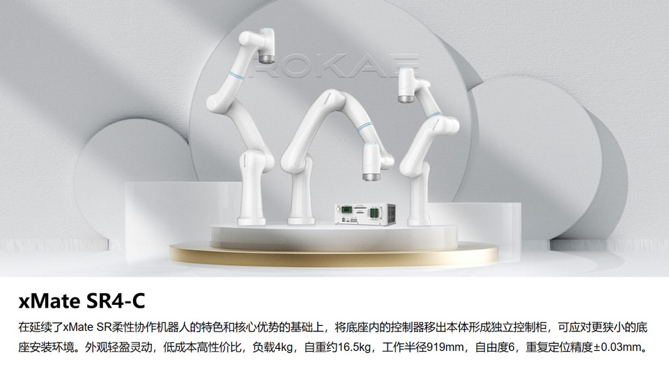 BFT机器人提供的珞石柔性协作机器人ROKAE xMate 系列珞石xMate SR4-C在延续了xMate SR柔性协作机器人的特色和核心优势的基础上,将底座内的控制器移出本体形成独立控制柜,可应对更狭小的底座安装环境。外观轻盈灵动,低成本高性价比,负载4kg,自重约16.5kg,工作半径919mm,自由度6,重复定位精度±0.03mm。