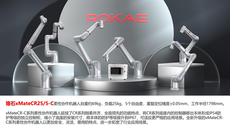 BFT机器人提供的珞石柔性协作机器人珞石xMate CR25/5-C柔性协作机器人自重约69kg,负载25kg,5个自由度,重复定位精度±0.05mm,工作半径1798mm。延续了CR系列刚柔并济、全面领先的功能特点,将CR系列底座内的控制器移出本体形成IP54防护等级的独立控制柜,缩小了底座的安装尺寸,将本体的防护等级提升到IP67,可适应更严格的应用场景。