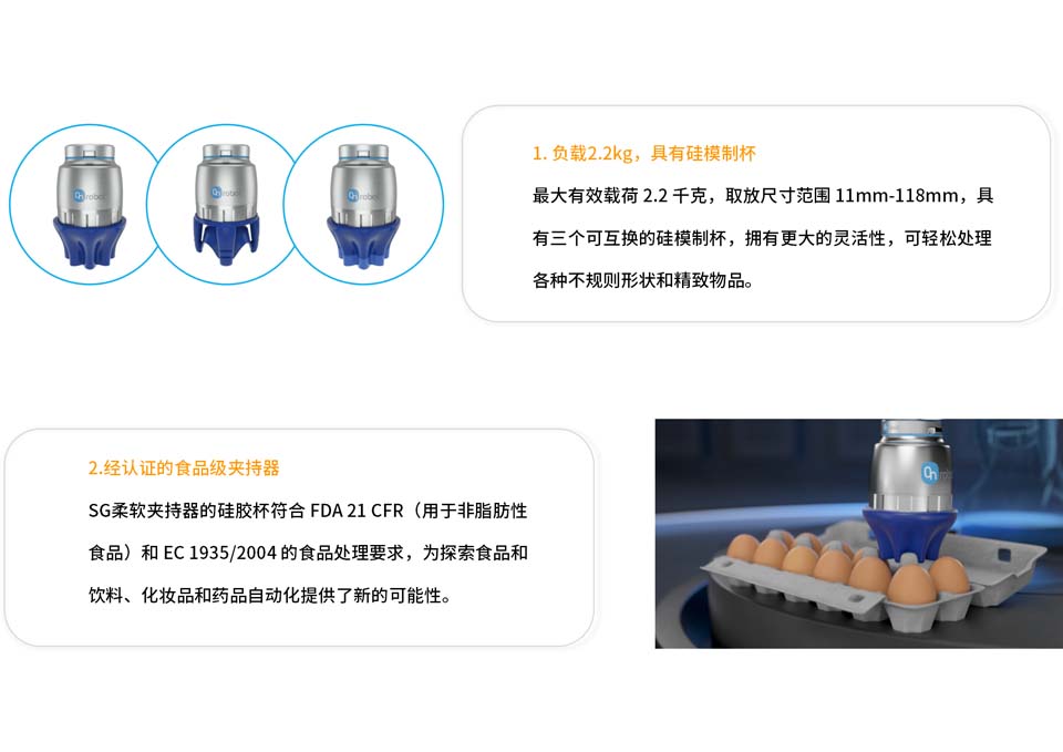 OnRobot SG柔软夹持器负载2.2kg,且SG是经认证的食品级夹持器,具有三个可互换的硅模制杯,能够取放各种不规则形状和精致物品,因此非常适合在食品和饮料生产以及制造或包装中进行取放应用,从鸡蛋到水果,再到瓶或罐,食品和饮料自动化取放都变得更加容易。