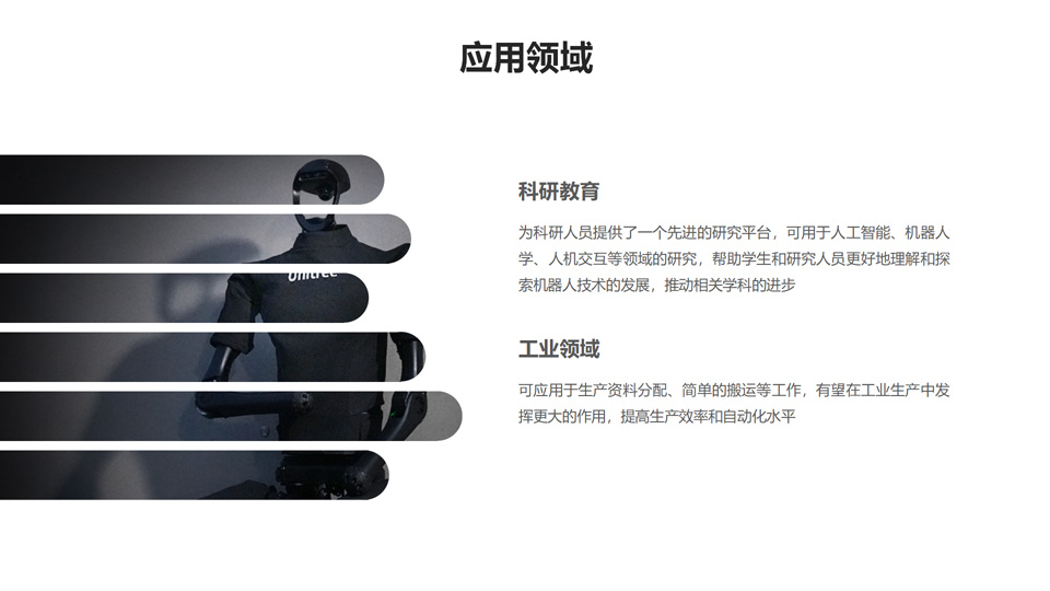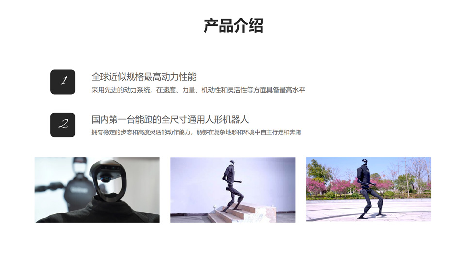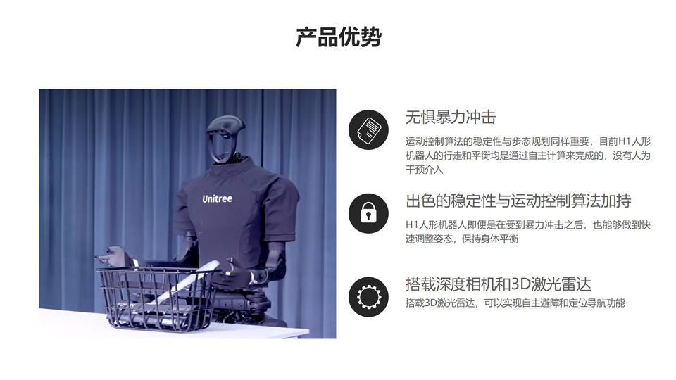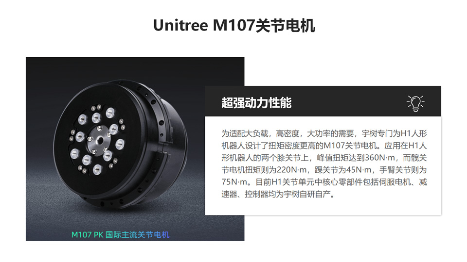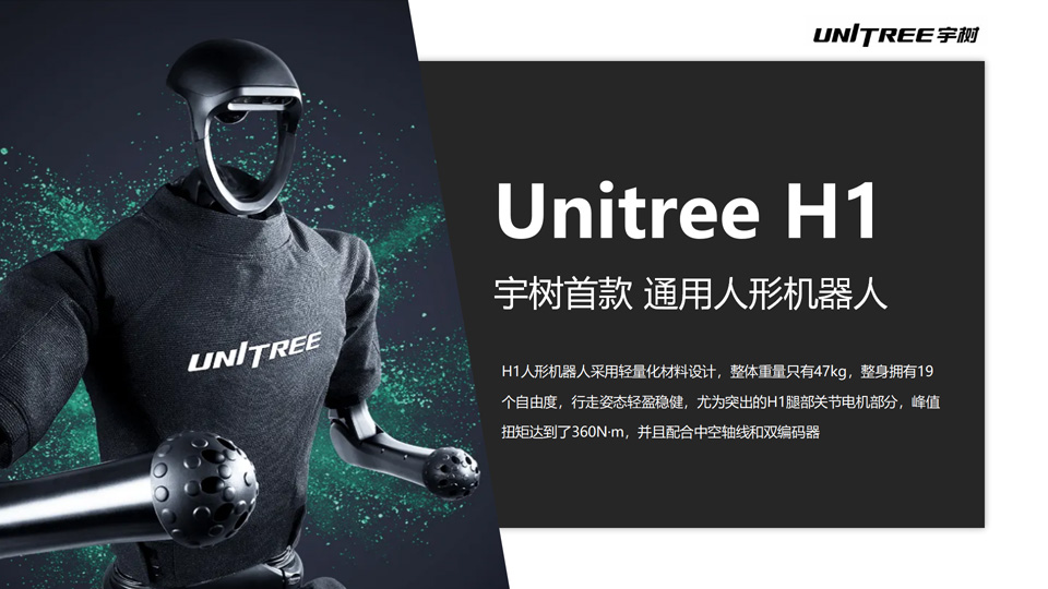 H1人形机器人采用轻量化材料设计,整体重量只有47kg,整身拥有19个自由度,行走姿态轻盈稳健,尤为突出的H1腿部关节电机部分,峰值扭矩达到了360N·m,并且配合中空轴线和双编码器。