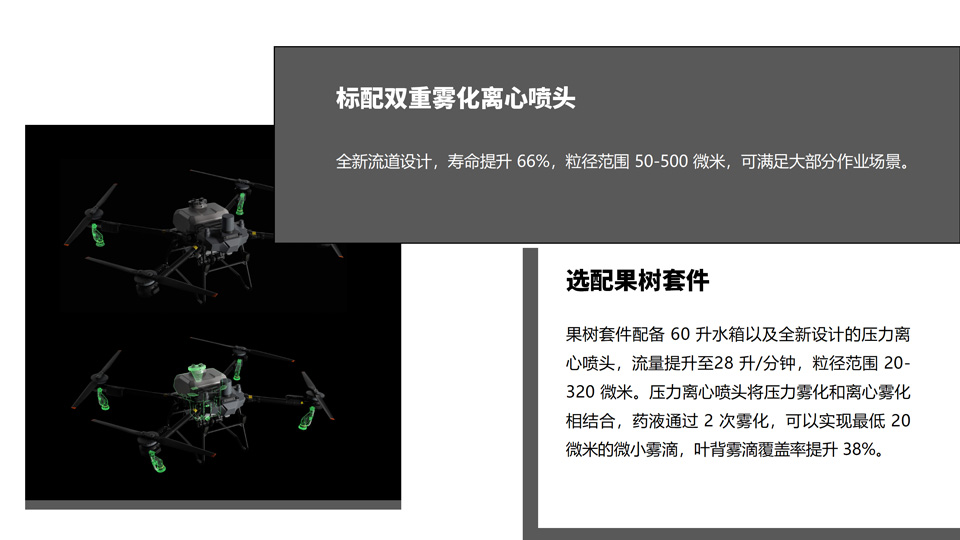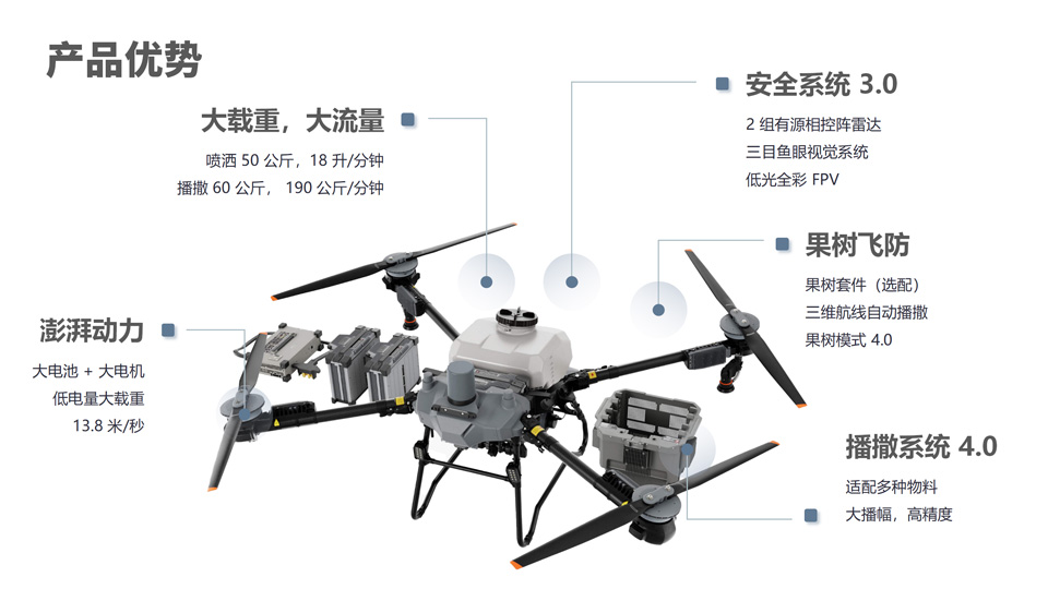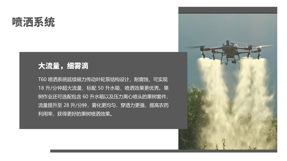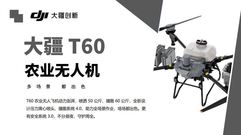 T60 农业无人飞机动力澎湃,喷洒 50 公斤、播撒 60 公斤,全新设计压力离心喷头、播撒系统 4.0,助力全场景作业,场场都出色。更有安全系统 3.0,不分昼夜,守护周全。