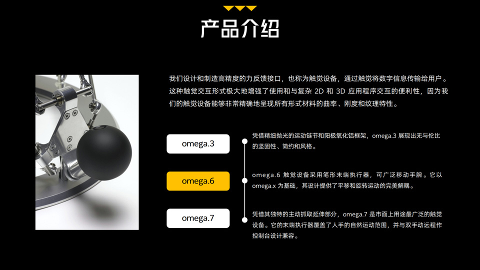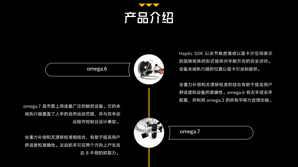 Omega.X 系列是 Force Dimension 公司推出的一系列高性能触觉力反馈设备,主要用于虚拟现实、机器人遥操作、医疗模拟、空间机器人等领域。我们设计和制造高精度的力反馈接口,也称为触觉设备,通过触觉将数字信息传输给用户。 这种触觉交互形式极大地增强了使用和与复杂 2D 和 3D 应用程序交互的便利性,因为我们的触觉设备能够非常精确地呈现所有形式材料的曲率、刚度和纹理特性。