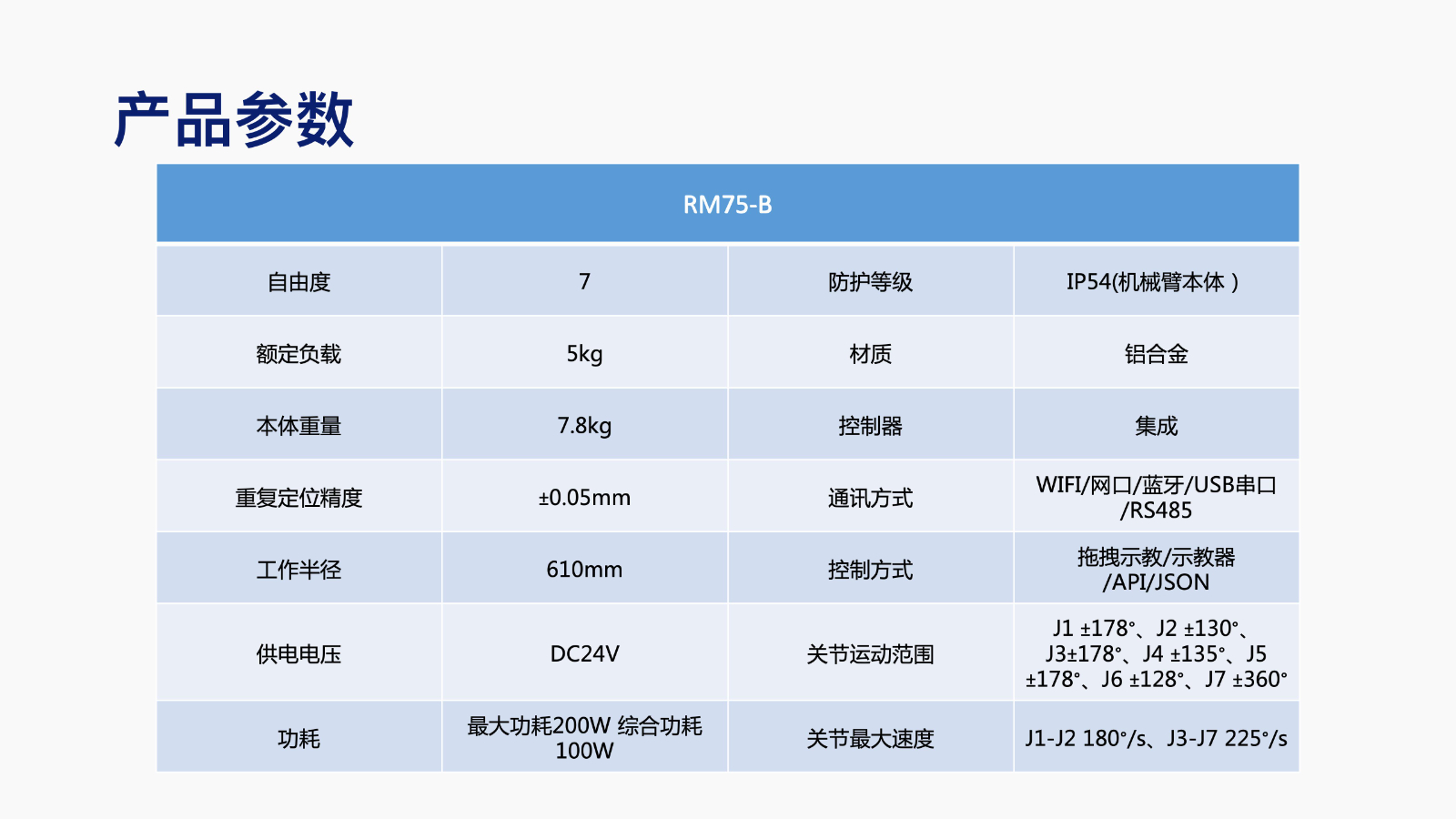 RM75-B为睿尔曼智能自主研发生产的七自由度标准版机械臂,一体化结构的控制柜与机械臂总重量7.8KG,额定负载达到5KG,峰值负载可达9KG,工作半径610mm。