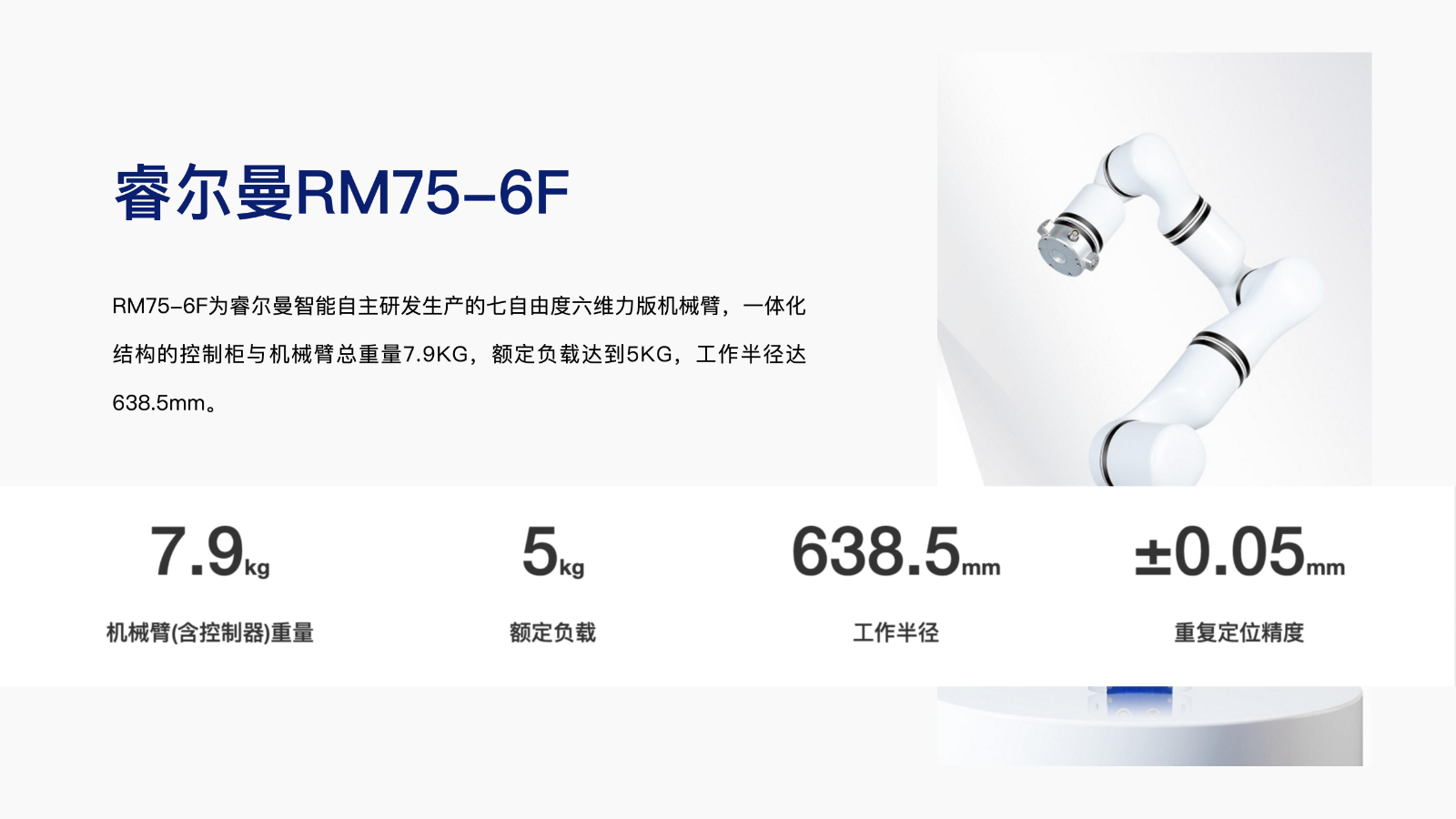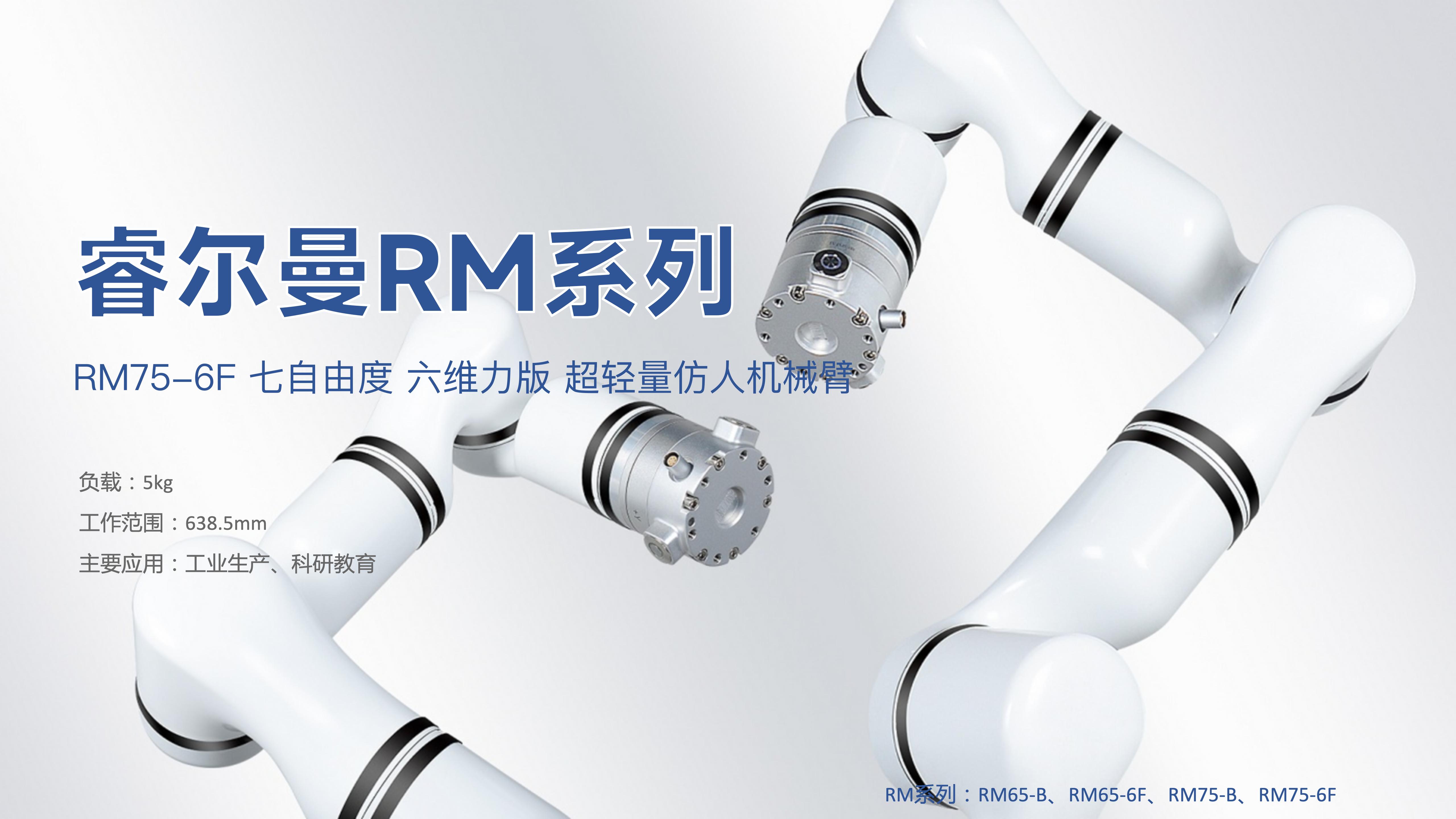 RM75-6F为睿尔曼智能自主研发生产的七自由度六维力版机械臂,一体化结构的控制柜与机械臂总重量7.9KG,额定负载达到5KG,工作半径达638.5mm。