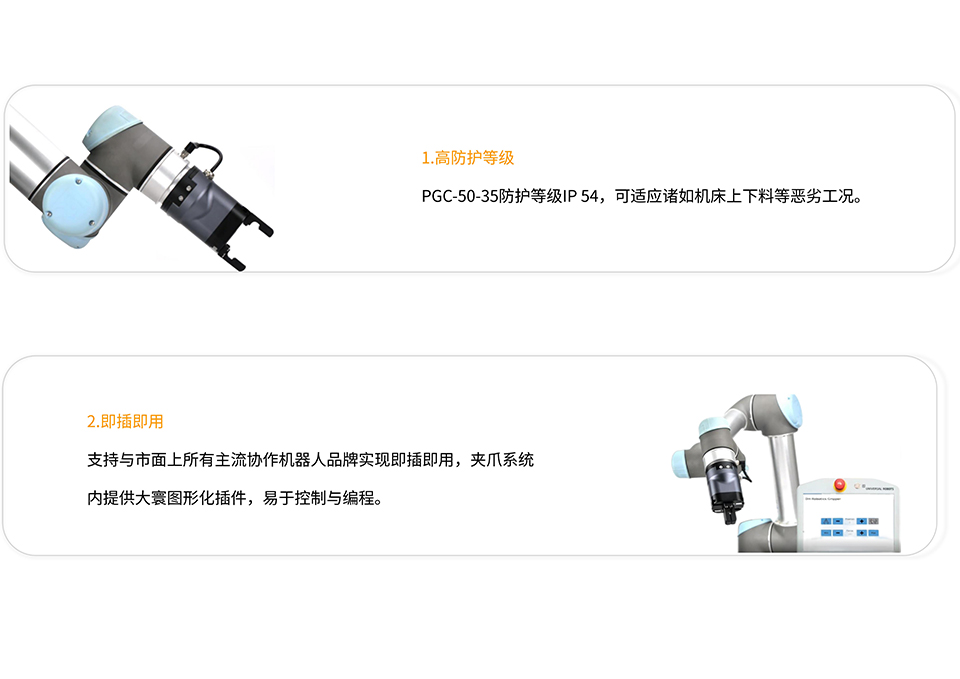大寰PGC系列防护等级高达IP54和IP67,可适用于诸如机床上下料等恶劣工况。支持与市面上所有主流协作机器人品牌即插即用,系统内提供大寰图形插件,易于控制与编程。