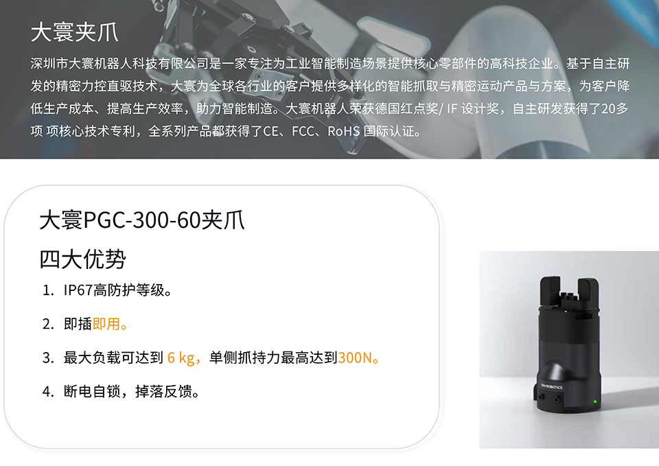 大寰PGC系列防护等级高达IP54和IP67,可适用于诸如机床上下料等恶劣工况。支持与市面上所有主流协作机器人品牌即插即用,系统内提供大寰图形插件,易于控制与编程。
