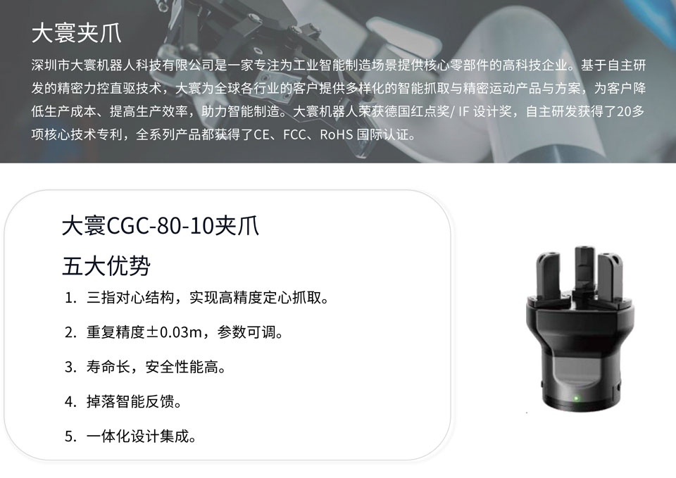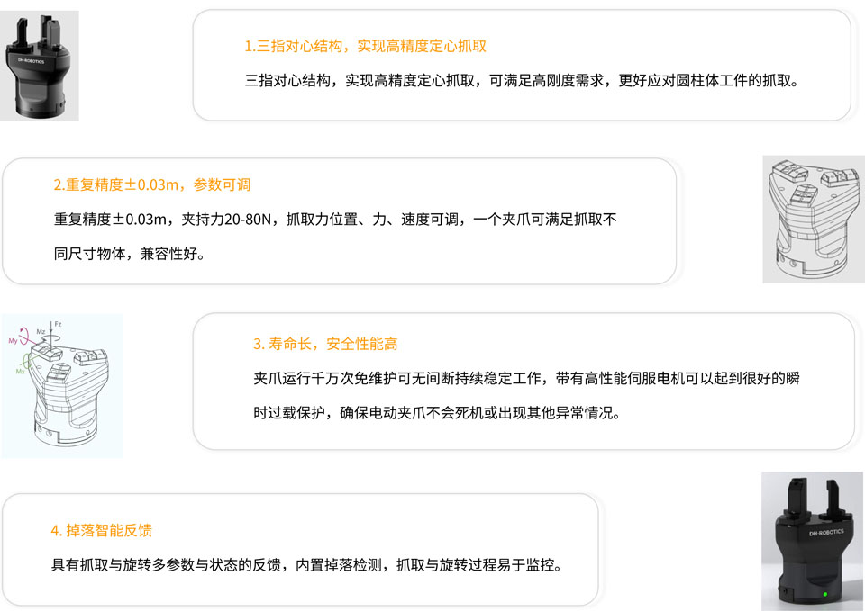 大寰CG系列三指伺服电爪驱动控制器与通讯一体集成在夹爪内部,无需任何附件,即插即用,掉电还能保持对工件的抓取,抓取过程安全性高。