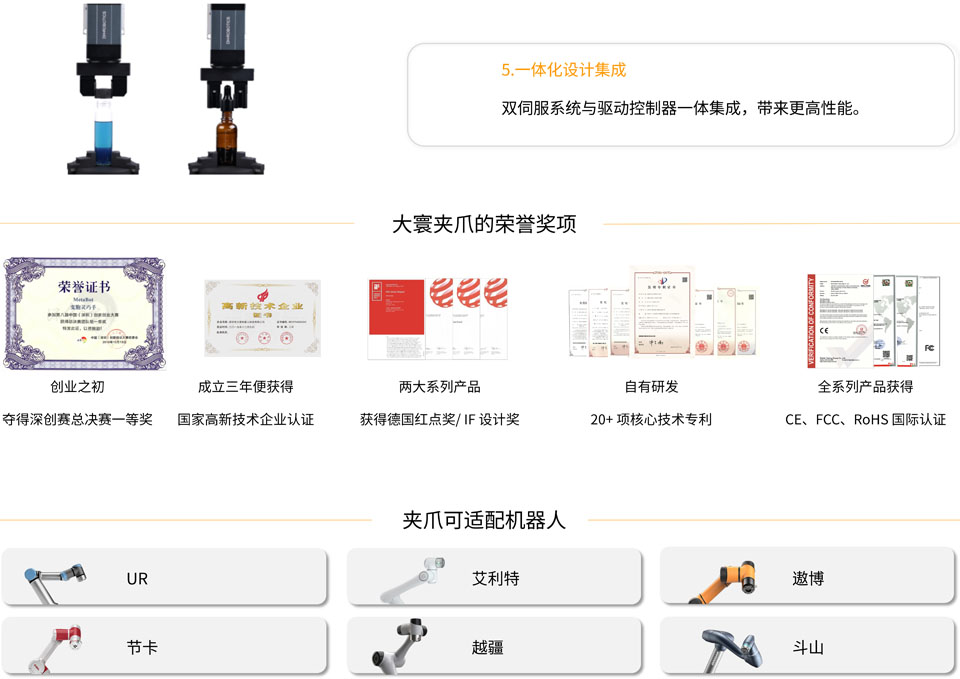 使用大寰大行程电动夹爪,夹爪对现场环境要求低、仅需电源与信号线,可同时进行精确位置控制,行程及力度可变,具有抓取反馈,可适应不同物体的抓取,无需更换手爪,实现一“手”多用,从而提升了机器人在柔性生产各个场景的抓取和操作能力,同时会降低整体方案成本,可稳定用于多行业的抓取上下料、组装装配、包装、分拣等场景下。