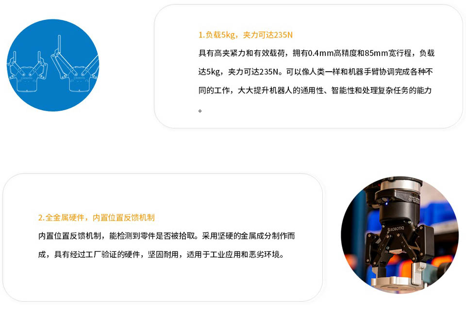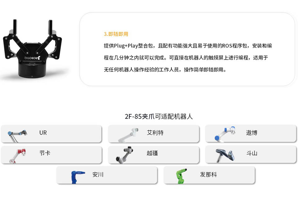 Robotiq 2f-85夹持器是专为实体制造业设计,适应复杂的工业环境,可以像人类一样和机器手臂协调完成各种不同的工作,大大提升机器人的通用性,智能性和处理复杂任务的能力。