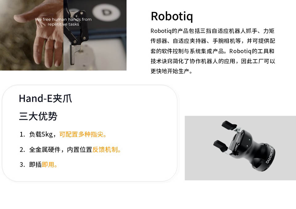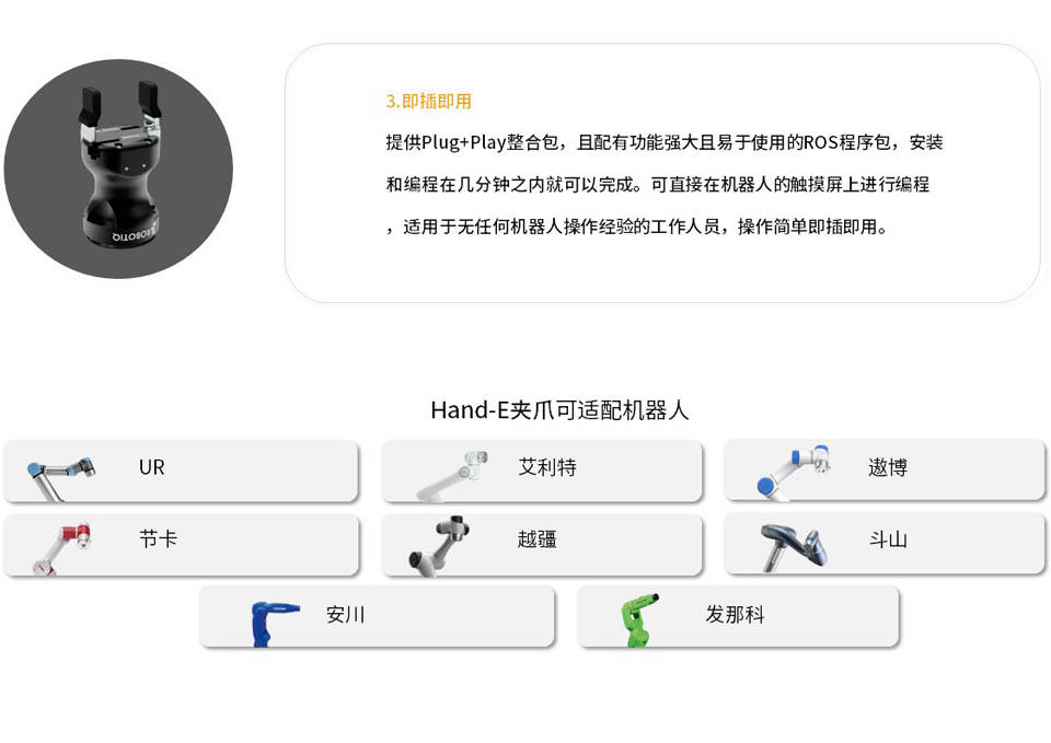 Robotiq的Hand-E抓手易于集成到您的生产环境中,并且易于所有技能水平的工人使用,无需机器人经验。借助我们的即插即用抓手套件,只需几分钟即可安装您的自适应抓手,然后使用我们直观的软件界面直接在机器人的触摸屏上进行编程。