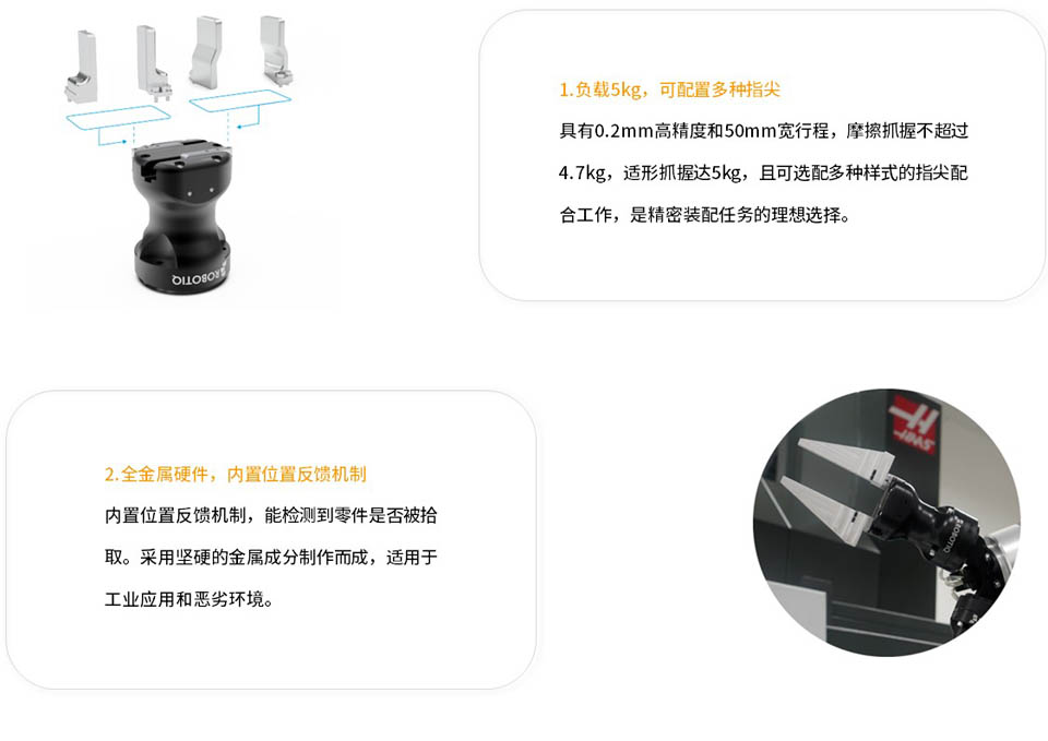 Hand-E 的高精度和 50 毫米平行行程使其非常适合精密装配任务,而其密封设计可确保在最恶劣的制造条件下(包括 CNC 加工)的可靠性。