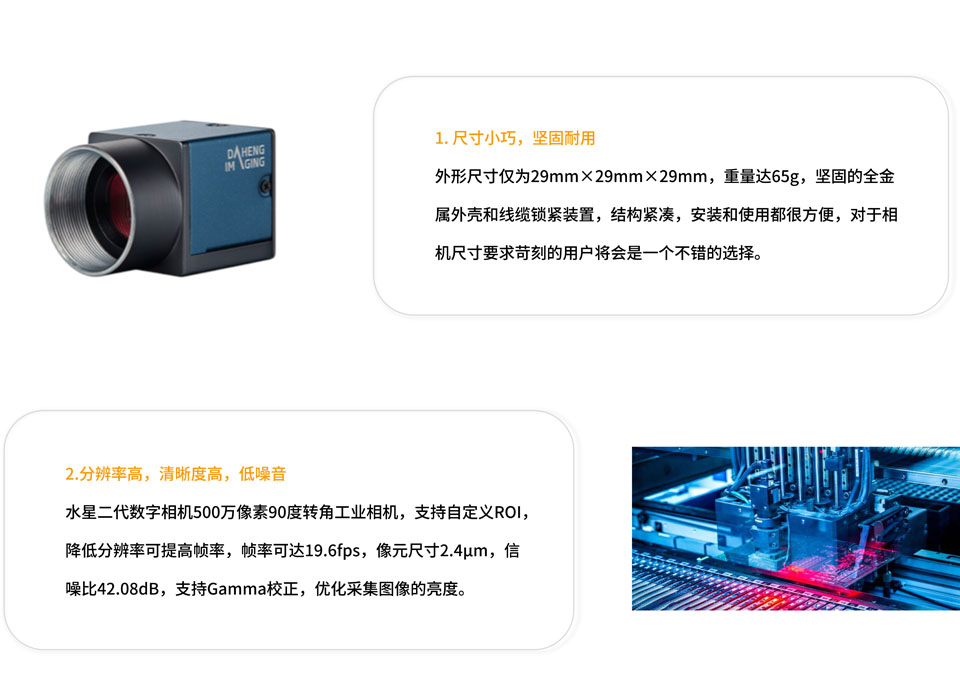 大恒图像MER2-2000-19U3M是一款采用行曝光的 Sony IMX183 CMOS 感光芯片,通过 USB3.0 数据接口进行 图像数据的传输的2000万像素工业相机。