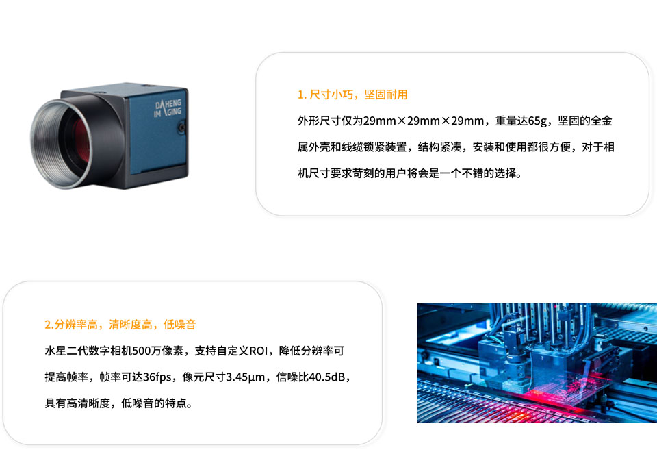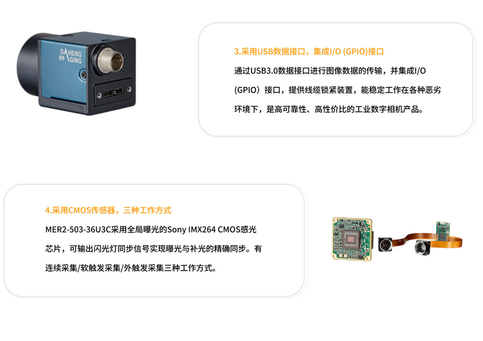 大恒图像MER2-503-36U3C是一款拥有连续采集 、软触发采集 、外触发采集三种工作方式,支持传输数据块可调功能,提供更好的兼容性和适应性的500万像素的工业相机。